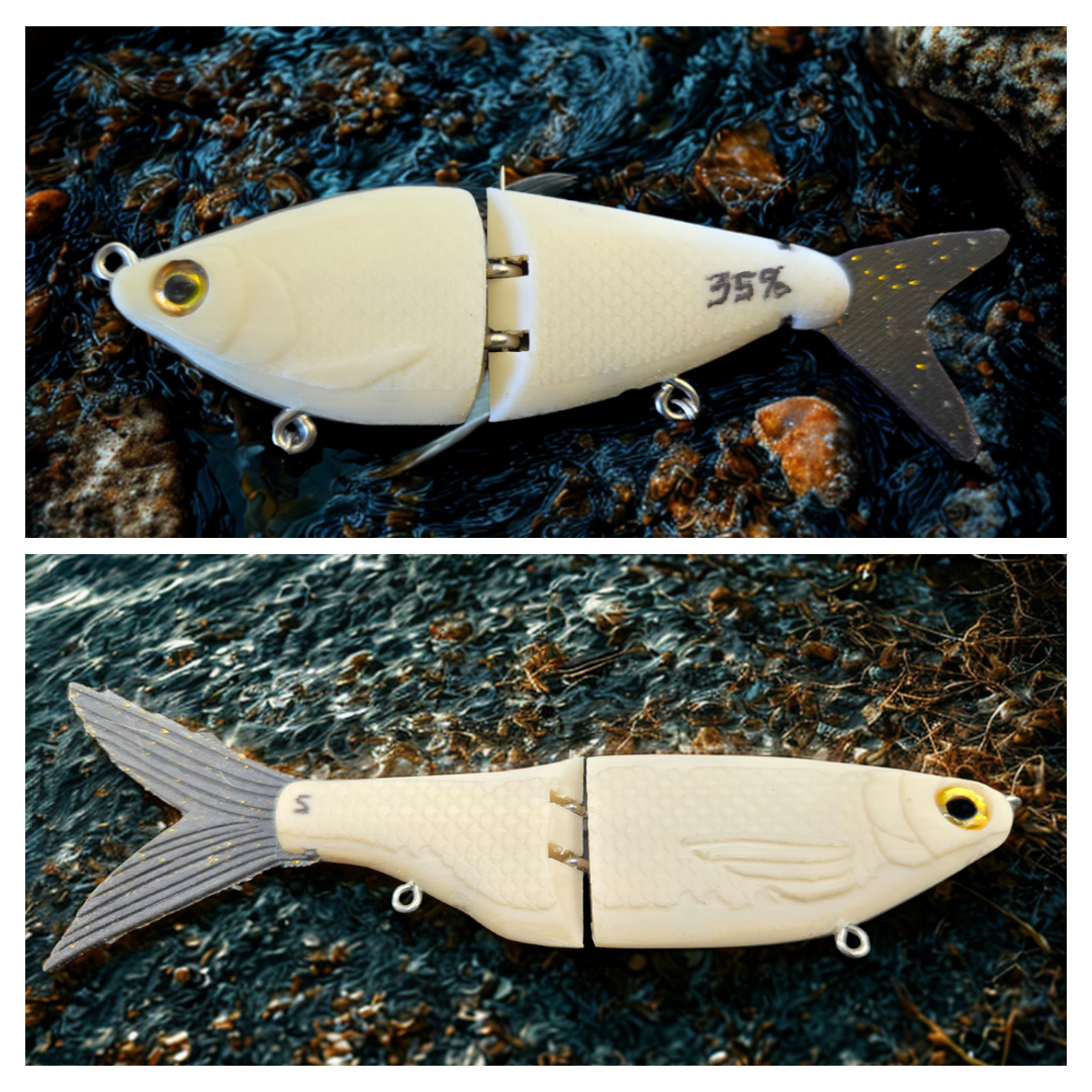 Our fishing lures are custom designed on PC, 3D printed with internal weights, and hand assembled.
